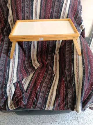 Mesa auxiliar plegable con patas, ideal para usar en la cama o el sofá. Su diseño permite tener una superficie estable para comer o trabajar. Medida 51cm. Largo por 31vm. ancho - Estructura de madera. - Superficie blanca.