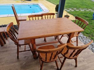 Conjunto de mesa y seis sillas de madera, ideal para bodegas o comedores rústicos, en buen estado, las medidas son 142x82 - Mesa de madera maciza. - Seis sillas de madera con respaldo.