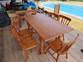 Conjunto de mesa de comedor maciza con seis sillas a juego. - Mesa de comedor de madera maciza. -Mesa extensible con capacidad para 10 personas. - Seis sillas tapizadas con diseño a cuadros. -restauradas hace poco tiempo.