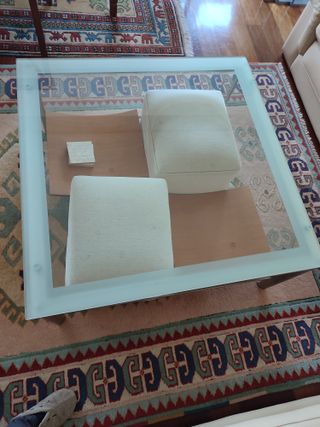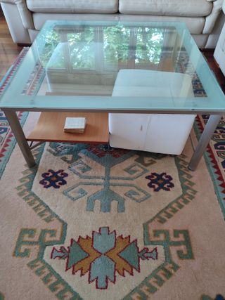 Mesa de centro - Estructura de madera. - Superficie de cristal. - Bandeja inferior adicional - con ruedas