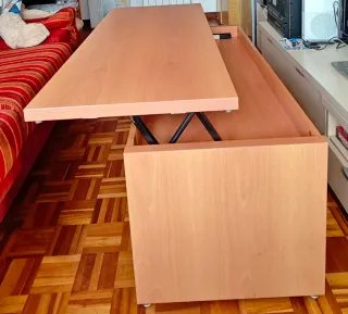 Mesa de centro con mecanismo elevable. - Diseño moderno y funcional. - Acabado en madera clara. - 50,5 cm de alto y eleva a 59,5 cm - Gracias a unos topes es fácil elevarla y cerrarla sin pillarte los dedos.