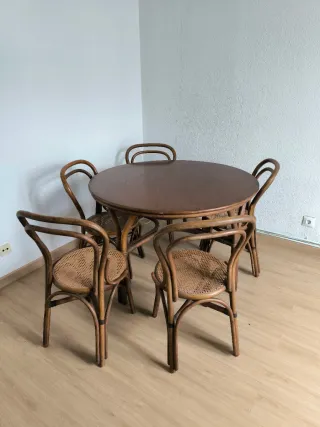 Conjunto de mesa redonda de madera con cinco sillas a juego. Ideal para comedor o cocina. - Mesa redonda de 120cm de diámetro. - Sillas de madera con asiento de rejilla. Medidas en las fotografias. Se recoge en Santander, zona Universidades. No envío.