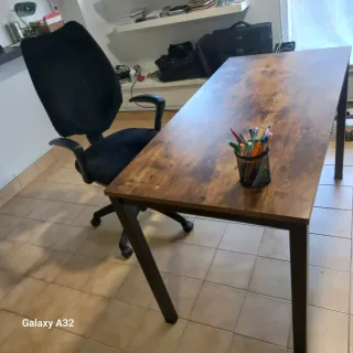 Escritorio con un diseño moderno que combina madera y metal. - Tablero con acabado imitación madera. - Patas y estructura de metal negro. estanteria a Juego silla y tv
