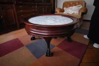 Elegante mesa de centro con un diseño circular y una combinación de materiales que aportan calidez y estilo. - Tablero de mármol con veteado natural. - Estructura y borde de madera oscura. - Patas talladas con detalle.