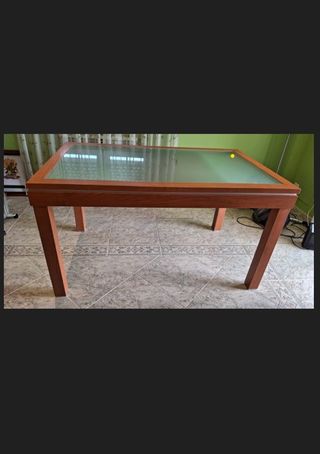 Mesa de comedor con estructura de madera y superficie de vidrio. Tiene una pieza extensible hasta una longitud total de 200 cm. Es una mesa consistente de excelente calidad y en muy buen estado. Las sillas no incluídas