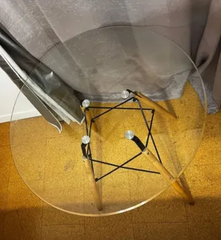 Mesa redonda cristal y madera.