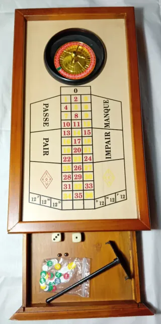 Miniatura de ruleta de casino con un diseño clásico de madera. Incluye accesorios para jugar. - Tablero de ruleta con números y apuestas. - Rueda de ruleta dorada. - Cajón extraíble con dados, fichas y marcadores.