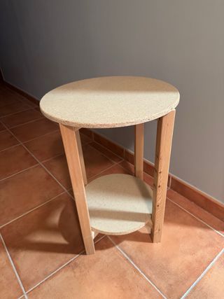 Mesa auxiliar de diseño moderno con dos superficies. - Tableros redondos de corcho. - Patas de madera natural.