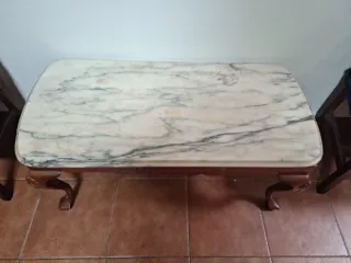 Elegante mesa auxiliar con superficie de mármol y estructura de madera. - Diseño clásico con patas curvas. - Detalle tallado en el frontal.