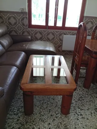 Elegante mesa de centro con un diseño rústico y robusto. - Fabricada en madera maciza. - Encimera de cristal con divisiones. - Patas gruesas y estables. Ver mi perfil para el conjunto completo.