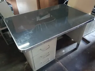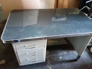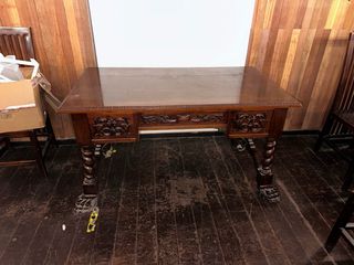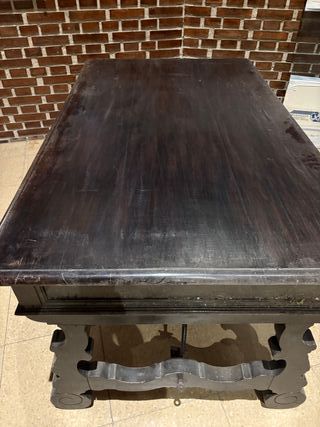 Mesa de madera maciza muy robusta tintada en un color oscuro. Tiene 3 cajones y por debajo 2 tirantes de metal que adornan y le dan estabilidad. Tiene algunos desperfectos, sería para restaurar, ver bien las fotos. Le faltan dos tornillos que sujetarían los tirantes al tablero, se ve en una de las fotos. Se entrega tambien con un cristal que cubriría el tablero. Se entrega desmontada para facilitar el transporte, es muy pesada. Mide aproximadamente 150cm x 90cm y 83cm de alto.