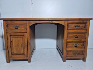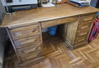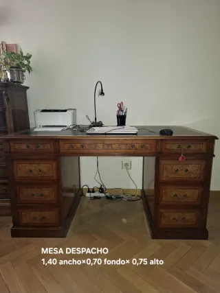 Elegante mesa de despacho antigua con un diseño clásico y funcional. Perfecta para tu oficina o estudio. - Amplia superficie de trabajo. - Múltiples cajones para almacenamiento. - Acabado en madera natural. RECOGER EN PERSONA
