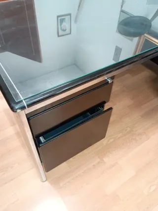 Elegante mesa de despacho con superficie de cristal y estructura metálica. - Cajonera de tres compartimentos. - Diseño contemporáneo.