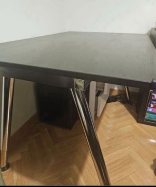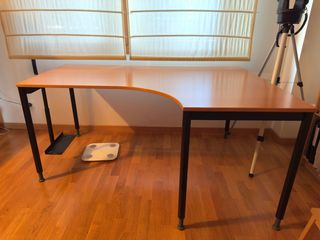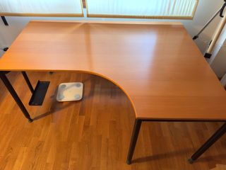 Precio si la desmontas y te la llevas. Mira las fotos para ver las marcas que tiene. Perfectamente usable. Mesa de escritorio en forma de L, ideal para optimizar el espacio en tu oficina o estudio. Su diseño combina la calidez de la madera con la robustez del metal. - Tablero de madera con acabado natural. - Patas metálicas en color gris.