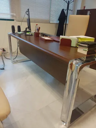 Elegante mesa de despacho en madera con bordes negros. Diseño clásico , robusta. Tiene algunos desperfectos como se aprecia en la foto La vendo porque en el nuevo despacho no me cabe