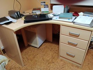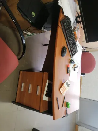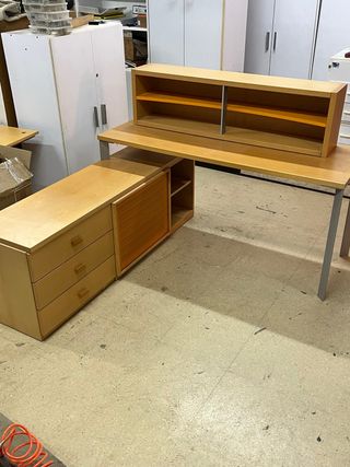 Conjunto de mobiliario para despacho. - Mesa de escritorio de madera. - Armario con estantes y puerta. - Cajonera Medidas: Mesa 59 fondo x 110 ancho x 73 alto Armario 1’38 alto x 40 fondo x 81 ancho Cajonera 56 alto x 65 fondo x 42 ancho Recoger en 3 semanas (cuando me llega el nuevo)
