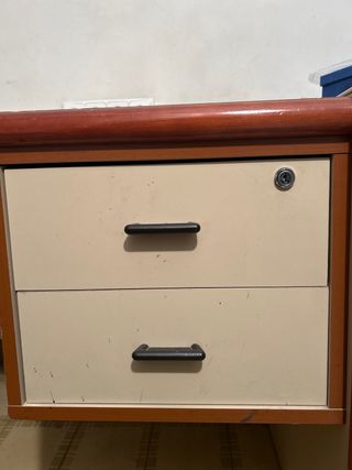 Mesa de despacho en buen estado, con un diseño elegante y funcional. - Superficie amplia para trabajar cómodamente. - Cajonera integrada con dos cajones. - Acabado en tonos beige y marrón.