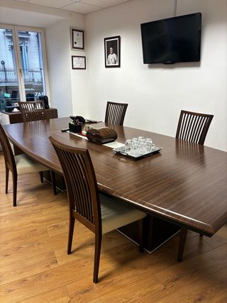 Vendo mesa de juntas / mesa de reuniones de gran formato, procedente de despacho de abogados. Madera natural/madera noble con acabado cálido tipo nogal, muy sólida y pesada, ideal para sala de reuniones, oficina premium, coworking o vivienda con comedor grande.
