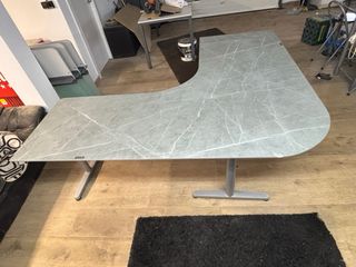 Elegante mesa de escritorio con superficie de Silestone y estructura metálica. - Diseño en forma de L. - Acabado en tonos grises y blancos veteados. La mesa la usabamos en la tienda para trabajar tiene unas medidas de 1,80M x2M en forma de L Tiene ese pequeño desperfecto que se ve en la foto. La mesa se puede aprovechar para hacer una meseta de cocina , o para mil cosas mas, es muy ressitente,