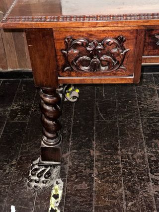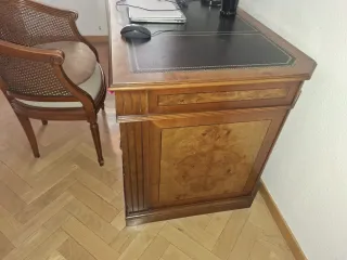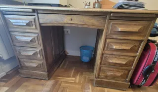 Mesa de madera de estilo antiguo, perfecta para un despacho o estudio. - Diseño clásico y robusto. - Amplia superficie de trabajo. - Cajones para almacenamiento. 150 vm de ancha x 120 de fondo
