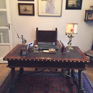Elegante mesa de despacho fabricada en madera de castaño. Su diseño clásico y robusto la hace ideal para cualquier oficina o estudio. - Acabado en tono oscuro. - Amplia superficie de trabajo. - Estructura sólida y duradera.