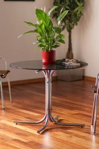 Mesa de los años 70 con estructura cromada y sobre redondo de cristal fumé. Patas inferiores regulables y totalmente funcionales para solventar posibles desniveles en el suelo. Ventosas renovadas. Ideal para dos o tres personas y donde queramos maximizar un espacio reducido. Úsala en tu terraza, como auxiliar en tu cocina o dale un toque especial a tu despacho. Visualmente ligera y elegante. Esta pieza presenta algunos signos de desgaste en la parte inferior de las patas no visibles en uso. Design diseño retro oficina industrial años60 tubular cromada comedor moderna metálica decoración bauhaus minimalista spaceage midcentury
