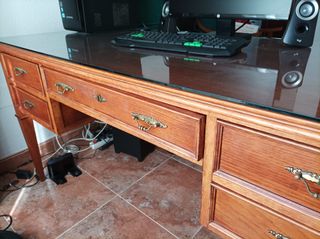 Elegante mesa de escritorio de estilo clásico, acabada en madera de cerezo y con tapa de cristal. - Diseño clásico y atemporal. - Tapa de cristal. - Cajones - Estructura de madera. Medida completa de la estructura 110x66 h:78 Regalo la silla a juego. Silla de debe tapizar por desgaste Necesario desmontaje y traslado a carga del comprador Si t interesa el Dormitorio completo con preciosa cama y armario a juego mirar otras ventas