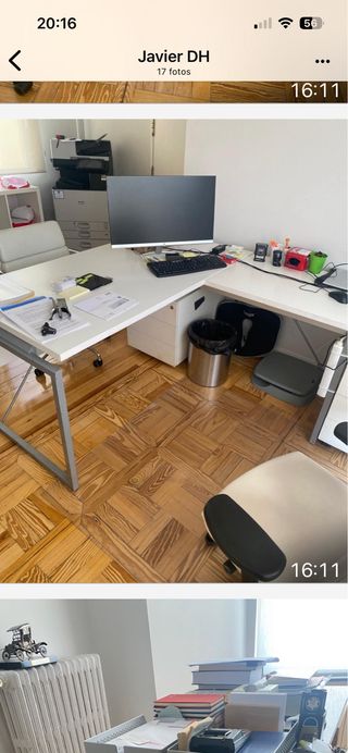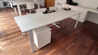 Conjunto de cuatro mesas de despacho. Cada mesa incluye un ala lateral, un book y una cajonera. Material madera DM, hace falta limpiarlas. Y se pueden pintar o lacar. Se entregan desmontadas con todos sus anclajes. Fácil montaje. 100€ cada mesa. Precio negociable. Medidas exactas Ancho 158 cm, Fondo simple 78 cm, fondo con ala 152 y Alto 76 - Diseño moderno y funcional. - Acabado en tonos beige y blanco. - Fabricadas en plástico y madera.