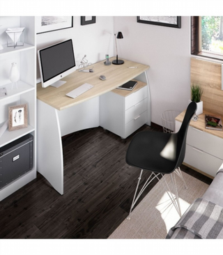 Amplia mesa de estudio o despacho con un diseño moderno. - Superficie de madera oscura. - Patas blancas. - Cajonera gris integrada con tres cajones Incluida Para recoger en Muebles La Factoría Asturias. Este producto no lo enviamos fuera de Asturias, portes hasta 50km por 50€.