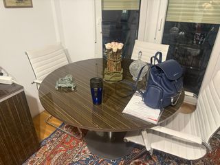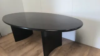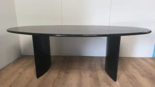 Elegante mesa de madera con un acabado en negro y detalles en marrón. Su diseño ovalado la hace ideal para despachos o salas de reuniones.Mide 2,20 por 75 de altura y 1,10 de ancha más mesas y cosas en mi perfil dispongo de furgoneta - Forma ovalada. - Base robusta y estilizada.