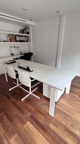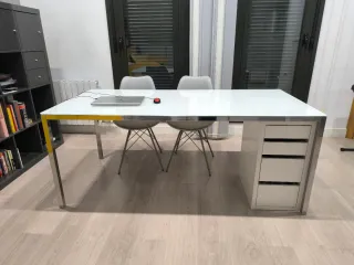 Escritorio de diseño minimalista en acabado lacado blanco. Muy elegante y robusto de madera maciza, perfecto para despacho o estudio moderno. Cuenta con 3 cajones integrados para organización y una estructura sólida. Ideal para oficina en casa, despacho profesional o decoración contemporánea. Estado muy bueno. Hay que recogerlo en un pueblo de Toledo.