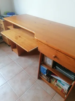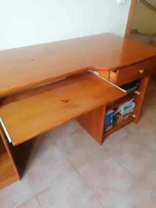 Mesa de despacho de madera de pino en buen estado. Un mueble clásico y funcional para tu oficina. Tiene 3 cajones y bandeja extraible para ordenador. - Diseño robusto y elegante. - Cajones integrados para almacenamiento.