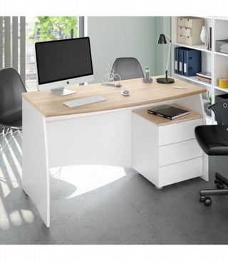 Mesa de despacho con un diseño moderno y funcional. - Acabado en madera y detalles en negro. - Incluye una práctica cajonera lateral.