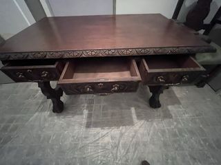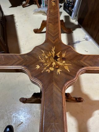 Vendo mesa de comedor clásica en color nogal oscuro de 2 metros de largo con bonito trabajo de marquetería en el tablero y estructura de madera tallada pieza muy decorativa y elegante con gran presencia visual destaca por su forma ondulada el dibujo central de marquetería y las patas talladas con acabado cálido y brillante ideal para salón comedor amplio despacho o proyecto de interiorismo se encuentra en buen estado general con señales normales de uso y paso del tiempo mesa robusta y vistosa perfecta como pieza principal de un conjunto clásico