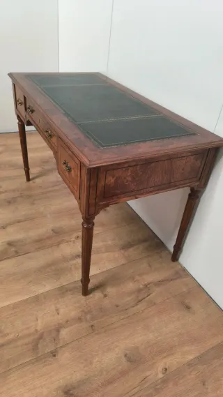 Elegante escritorio de estilo Luis XVI, perfecto para un despacho o estudio.Medidas 1,25 de largo por 80 de ancho y 75 de altura dispongo de furgoneta - Encimera con detalles en cuero. - Patas torneadas de madera. - Cajones con tiradores ornamentados.