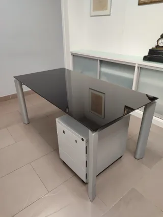Elegante mesa de despacho con un diseño moderno y minimalista. PRECIO POR MESA. - Tablero de cristal. - Patas y estructura de metal. - Cajonera independiente, 3 cajones.