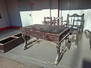 Vendo despacho antiguo compuesto por sillón de trabajo, sillones confidentes, mesa escritorio, mesa auxiliar y armario. Todos los muebles son macizos y están labrados, los sillones han sido restaurados. Tienen 80 años y alto valor decorativo. Se podría considerar venta separada y el precio es negociable. Están en Zaragoza.