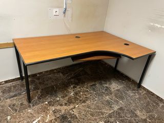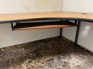Mesa de oficina con diseño angular, ideal para optimizar el espacio. Mesa despacho. - Superficie de madera en tono marrón. - Estructura de patas metálicas en color negro. - Incorpora un soporte extraíble para teclado. También tengo un archivador y una cajonera pequeña