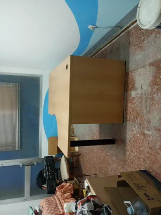 Oportunidad, se vende a precio de saldo por tener que desalojar el piso. Son muebles de calidad, en su día costaron más de 1000€, hace 15 años. Actualmente está como se ve en la foto principal pero en un armario es posible que haya la parte que falta. Interesados tendrían que ir a buscarlo como muy tarde este fin de semana. Lugar de recogida Salou Conjunto de mobiliario de oficina que incluye una mesa de despacho y una estantería a juego. - Mesa con superficie de madera y estructura gris. - Estantería con diseño abierto y acabado en madera y gris.