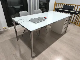Mesa de escritorio o despacho funcional. - Diseño moderno y limpio. - Amplia superficie de trabajo. - Cajonera integrada para almacenamiento. Contiene cajón y armario para almacenaje Es nuevo Si es esta semana serían 40 euro