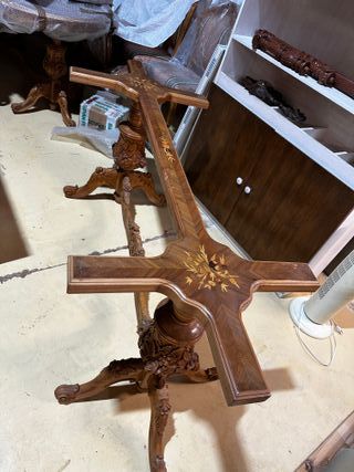 Vendo base de mesa grande en color nogal de 2 metros perteneciente a conjunto clásico pieza muy decorativa con gran presencia visual destaca por su estructura alargada con marquetería floral y pies centrales tallados con mucho detalle ideal para colocar un cristal a medida y crear una mesa de comedor elegante y muy especial perfecta para salón comedor amplio despacho o proyecto de interiorismo se encuentra en perfecto estado madera en tono nogal cálido con acabado clásico y gran valor decorativo