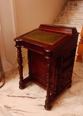 Antiguo escritorio secreter tipo Davenport muy característico del mobiliario inglés. Es una mesa de tamaño reducido, acompañada de diferentes juegos de cajones, 4 laterales y compartimentos para guardar los útiles de escritura y de despacho. En la parte superior tiene un tablero inclinado forrado en un elegante cuero verde. En color caoba, es de madera maciza y de alta calidad. Es muy decorativo y queda fenomenal como mueble auxiliar. En buen estado general, a pesar de los años. Se trata de un objeto muy apreciado hoy en día por interioristas y decoradores por su estética atractiva.
