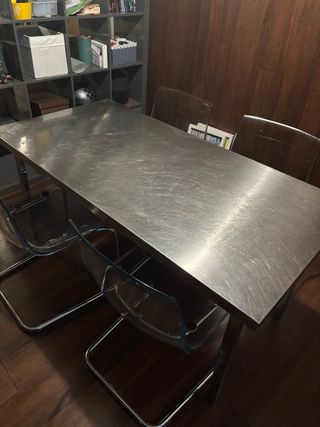 Vendo mesa IKEA modelo Vika Hyttan con encimera de acero inoxidable + 4 sillas transparentes estilo policarbonato. Muy resistente, ideal tanto para comedor como para despacho o estudio. Estado: usada, con marcas normales en el acero del uso (ver fotos), pero totalmente funcional y estable. Las sillas están en buen estado general, sin roturas.