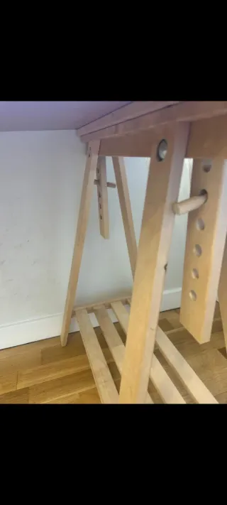 Vendo mesa tipo escritorio montada con tablero IKEA y 2 caballetes IKEA FINNVARD con estante, en color blanco. Ideal para despacho/estudio: estable, amplia y con estante inferior para guardar cosas sin invadir el tablero. El tablero está en buenas condiciones, aunque tiene alguna marca normal de uso (nada roto ni hinchado). Medidas del conjunto (mesa): Tablero: 150 x 75 cm Altura montada: 74 cm Caballetes (IKEA FINNVARD con estante, regulables): Modelo: FINNVARD Medidas por caballete: 46 cm (ancho) x 70 cm (fondo) x 71–93 cm (alto regulable) Incluye: 1 tablero 150x75 cm 2 caballetes FINNVARD