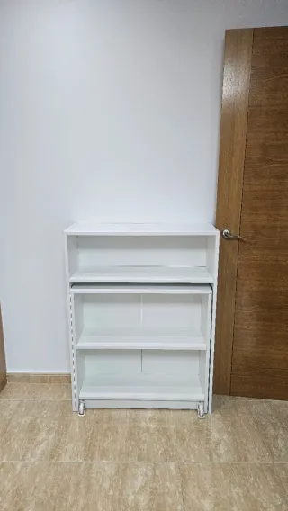 Estantería BILLY blanca, ideal para organizar tus libros y objetos. Mesa auxiliar abatible que se esconde en la propia estantería, lleva ruedas. Comprada en octubre de 2025. IKEA estantería mesa auxiliar billy coleccionismo libros organización despacho escritorio
