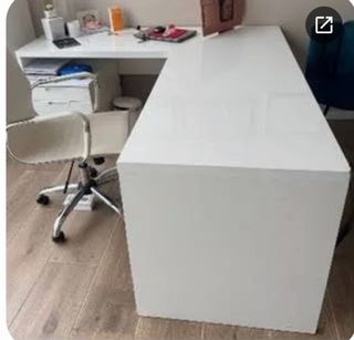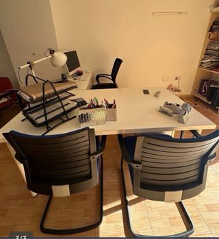 URGE VENDER POR CIERRE!! Hazme una oferta. Todo por 370€. Pregunta combinaciones. 1Mesa moderna y espaciosa para tu oficina o despacho. 2,7*2,7 lacada en blanco 120€ - Diseño elegante en blanco. - Superficie amplia para trabajar cómodamente. 1 mesa blanca 1,50 * 60/// 30€ 1 mesa escritorio ikea blanca /// 30€ 2 sillas director negras (una con espalda naranja) // 30€ cada una 4 sillas de despacho (2 azules de oficina y 2 butacones tonos rosas) 50€ la pareja. 30€ cada una 2 cajoneras de madera blanca. 20€ cada una