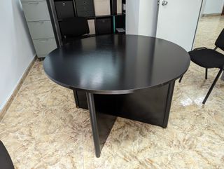 Mesa redonda para despacho, de madera en color wengue , con 4 sillas. Está en buen estado, aunque la mesa cojea un poco. Este conjunto si de comprar nuevo, estaría por encima de los 350€. Se puede vender solo la mesa o solo las sillas. tengop más sillas disponibles, en total tengo 10 sillas. Solo la mesa 80€ Solo las sillas, 30€ por silla. No hago envíuos, no llevo a ningún sitio. Puedes venir a verla, está en Alcalá de Henares. Solo por las tardes. También tengo disponible mesas, estanterías y otros muebles, por el cierre de una oficina, consultame y por comprar varios productos, ajusto el precio.