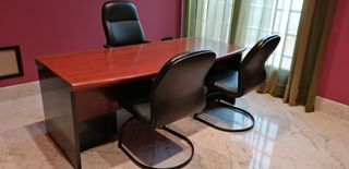 Conjunto de mesa de despacho y tres sillas. - Mesa con superficie de madera. - Estructura de las sillas de metal.