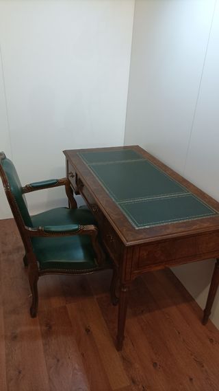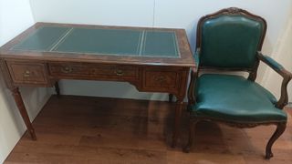 Conjunto de mesa de despacho y dos sillas de oficina de estilo clásico. La mesa cuenta con un tablero de cuero verde y la estructura es de madera maciza. - Mesa de madera maciza con detalles tallados y 9 cajones. Las medidas de la mesa son 196x88,5x76cm (largo, ancho y alto) - Dos sillas de madera maciza a juego con tapicería de cuero verde. El precio se ha de negociar.