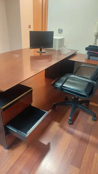 Mesa despacho escritorio de oficina con cajonera en buen estado el lateral se puede poner a derecha o izquierda medidas 1,80 x 1'80 por 73 de altura y 80 de profundidad cajonera 57 de ancha por 59 de altura y 43 de profundidad más mesas y cosas en mi perfil dispongo de furgoneta